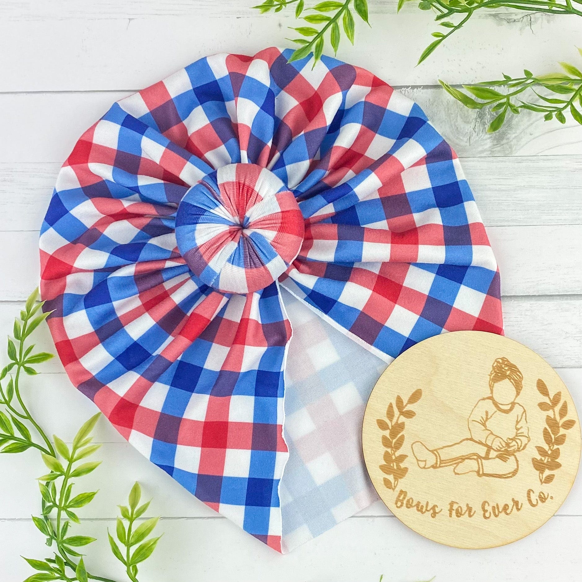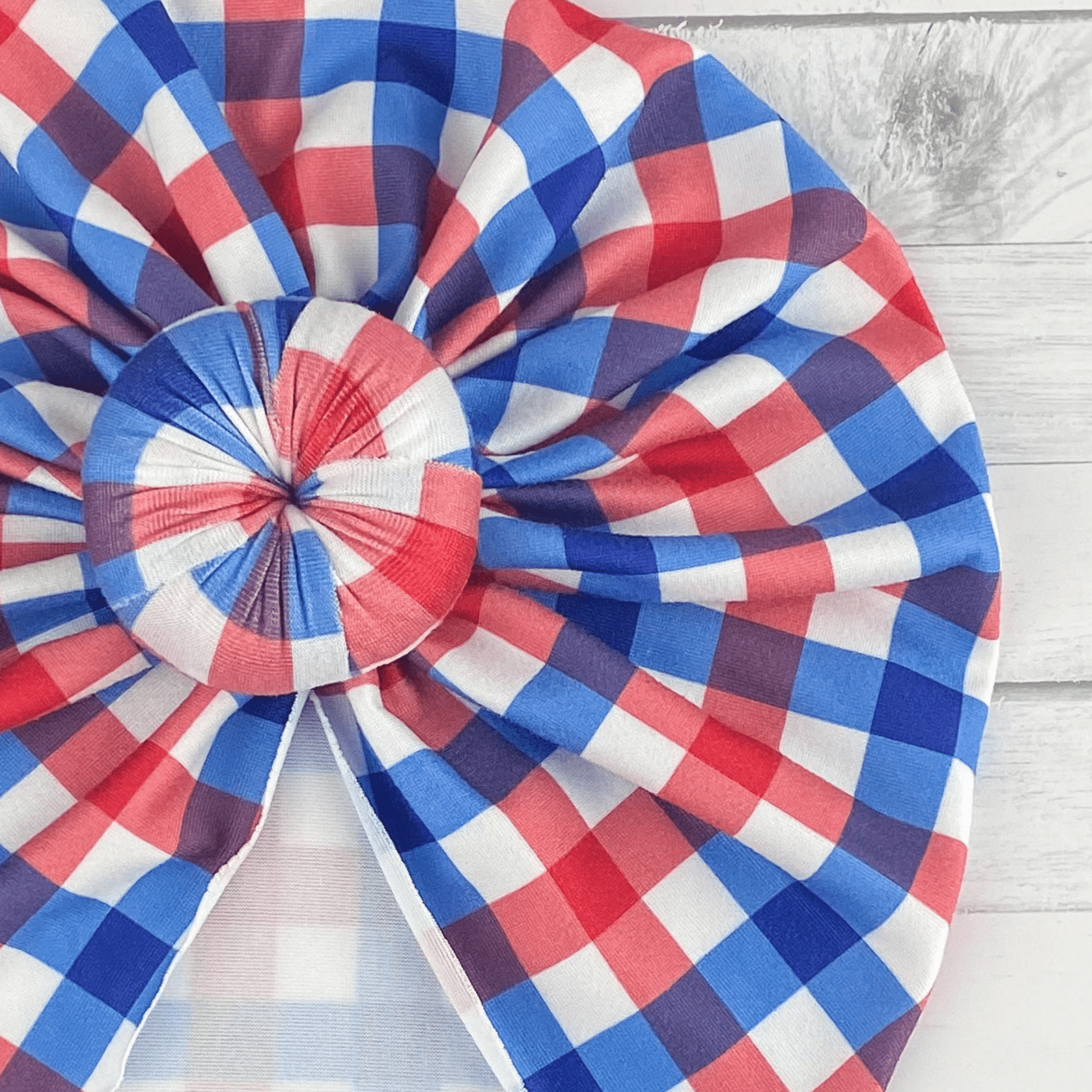 Our 4th of July Plaid turban is made with a super soft and stretchy knit fabric.
