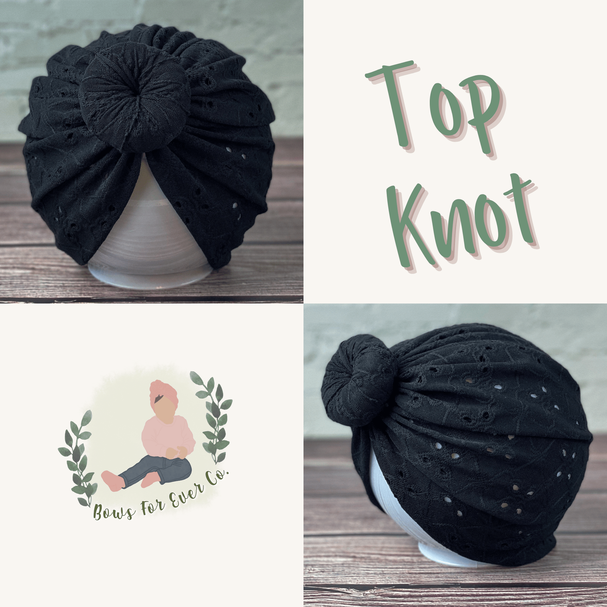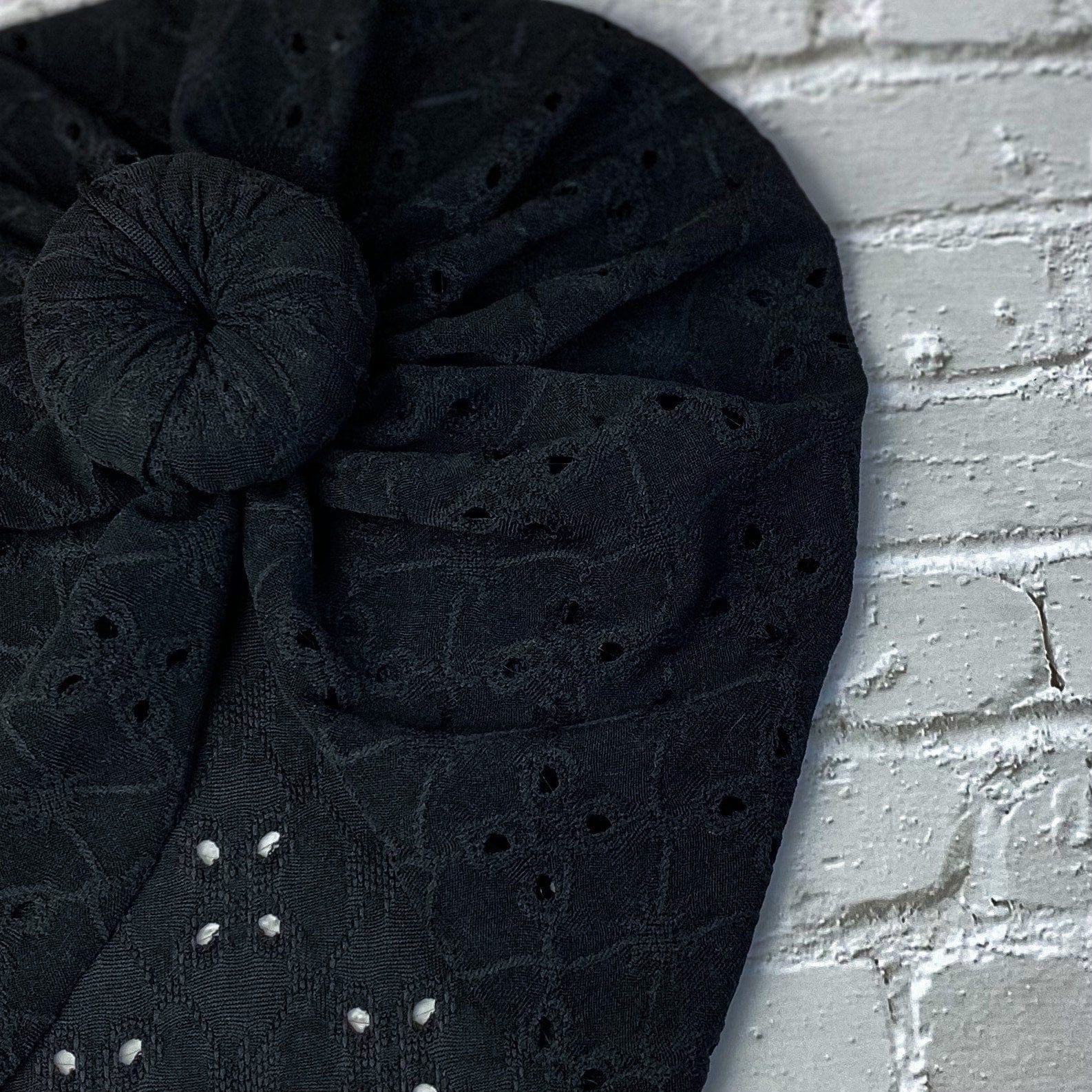 Our Black Eyelet turban is made with a super soft and stretchy knit fabric. It's the perfect way to finish any outfit.
