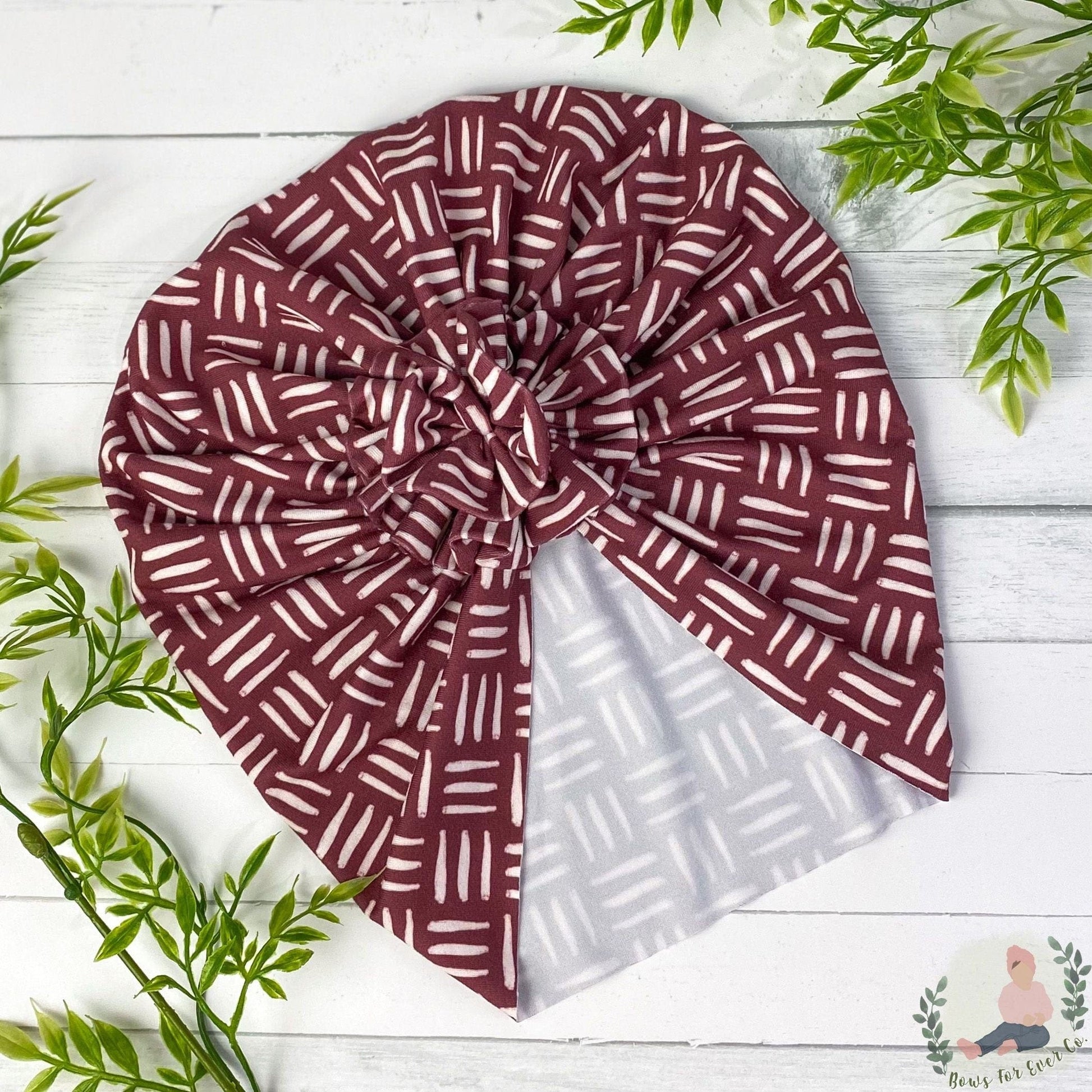 Our Burgundy Mudcloth turban is made with a super soft and stretchy knit fabric.