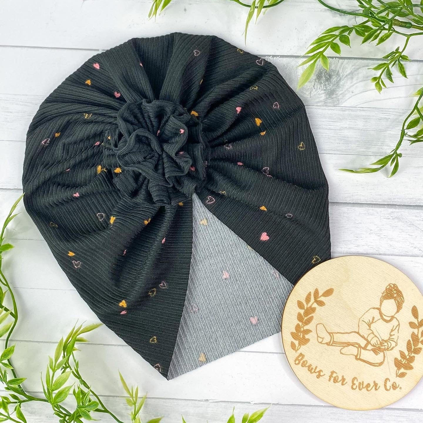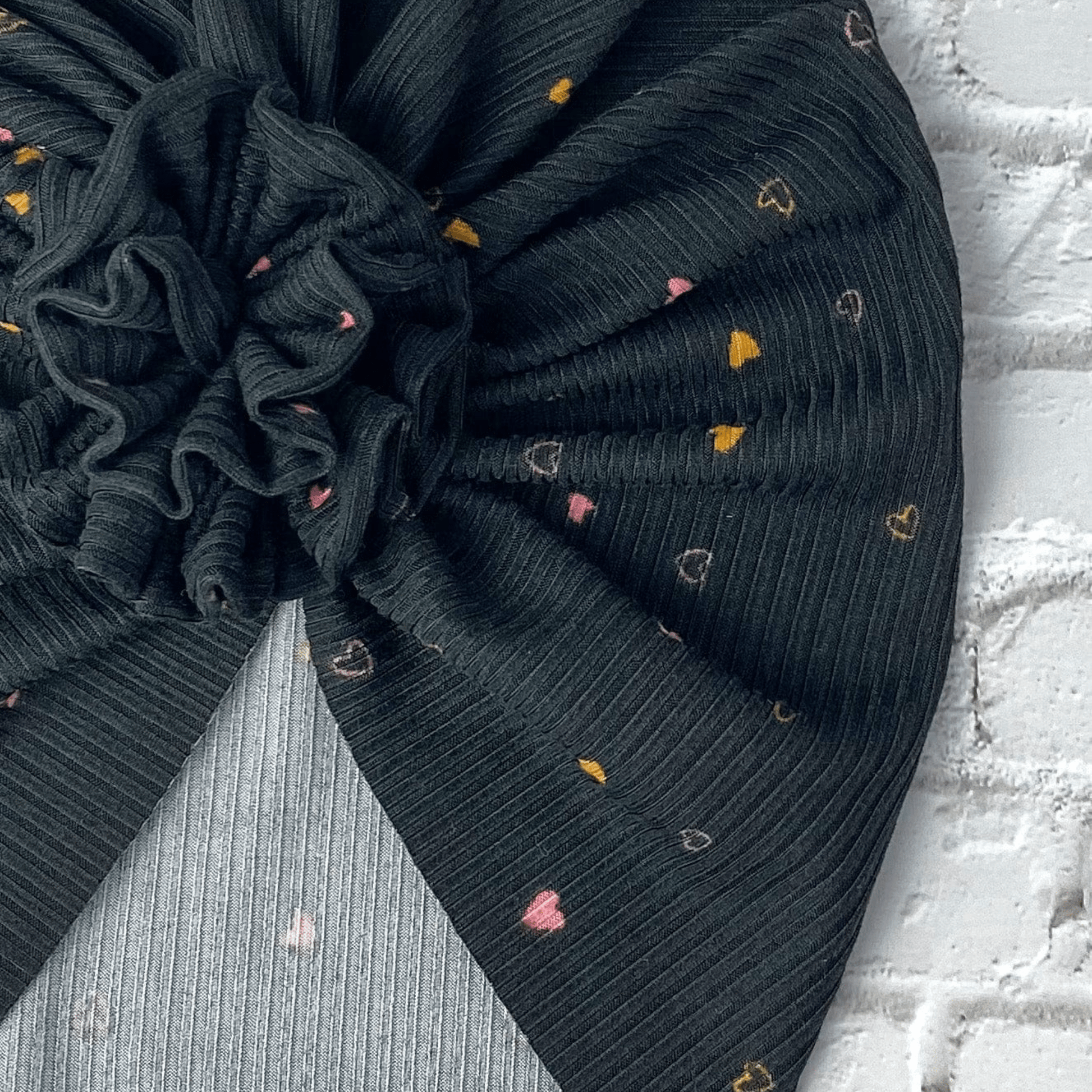 Our Ribbed Black Dainty Hearts turban is made with a super soft and stretchy knit fabric.