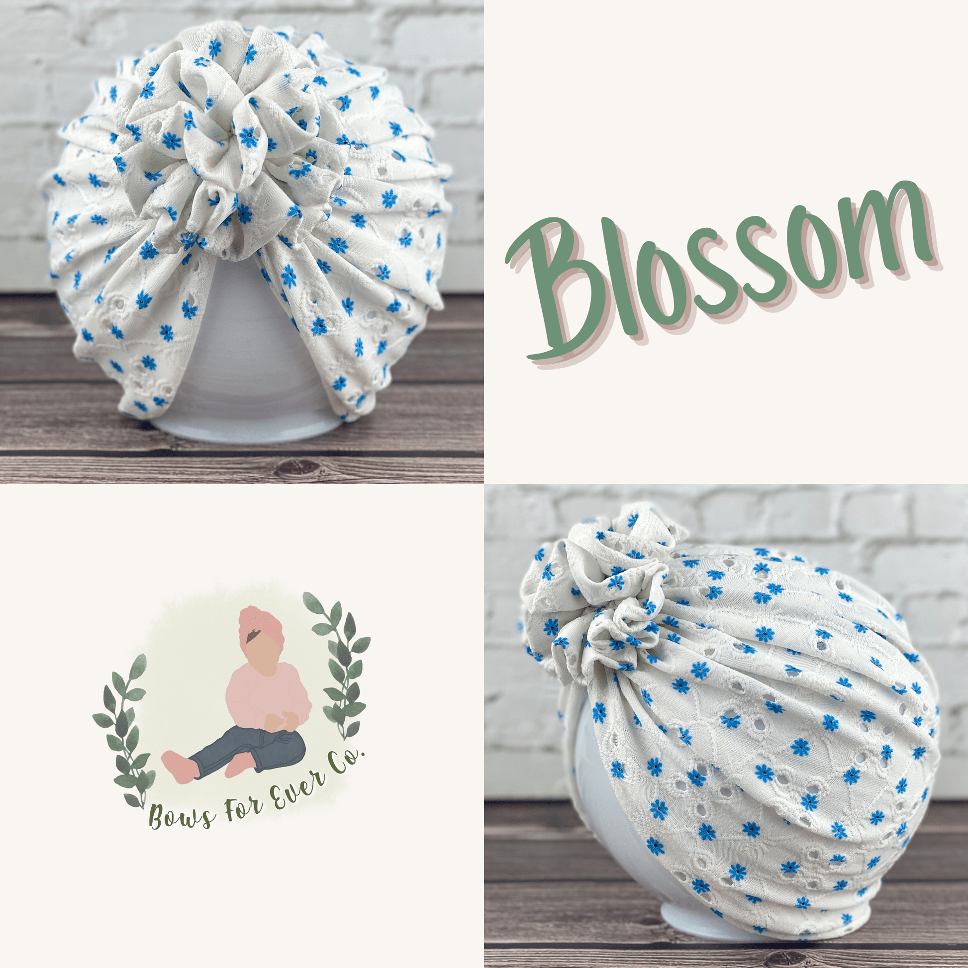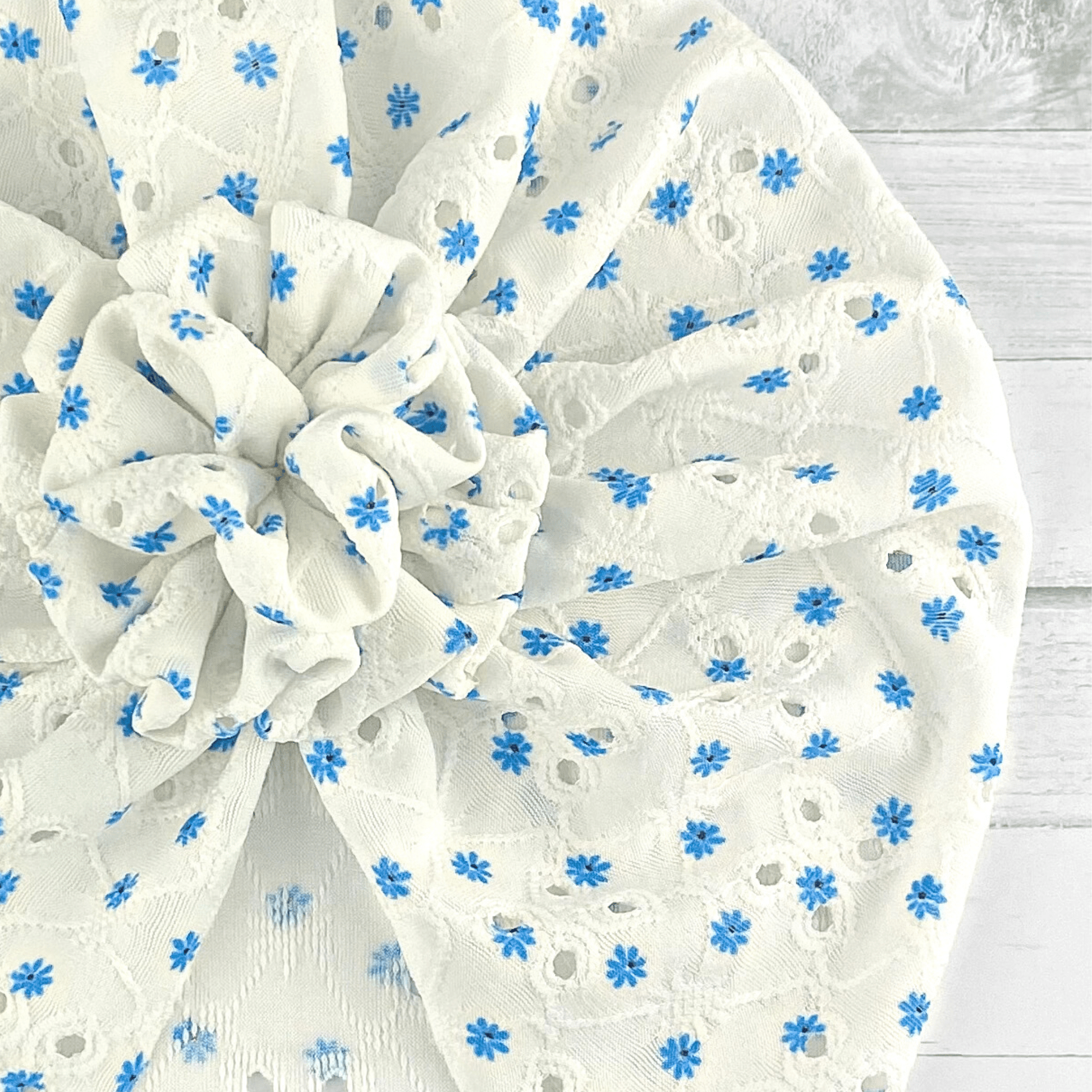 Our Ditsy Blue Floral Eyelet turban is made with a super soft and stretchy knit fabric.