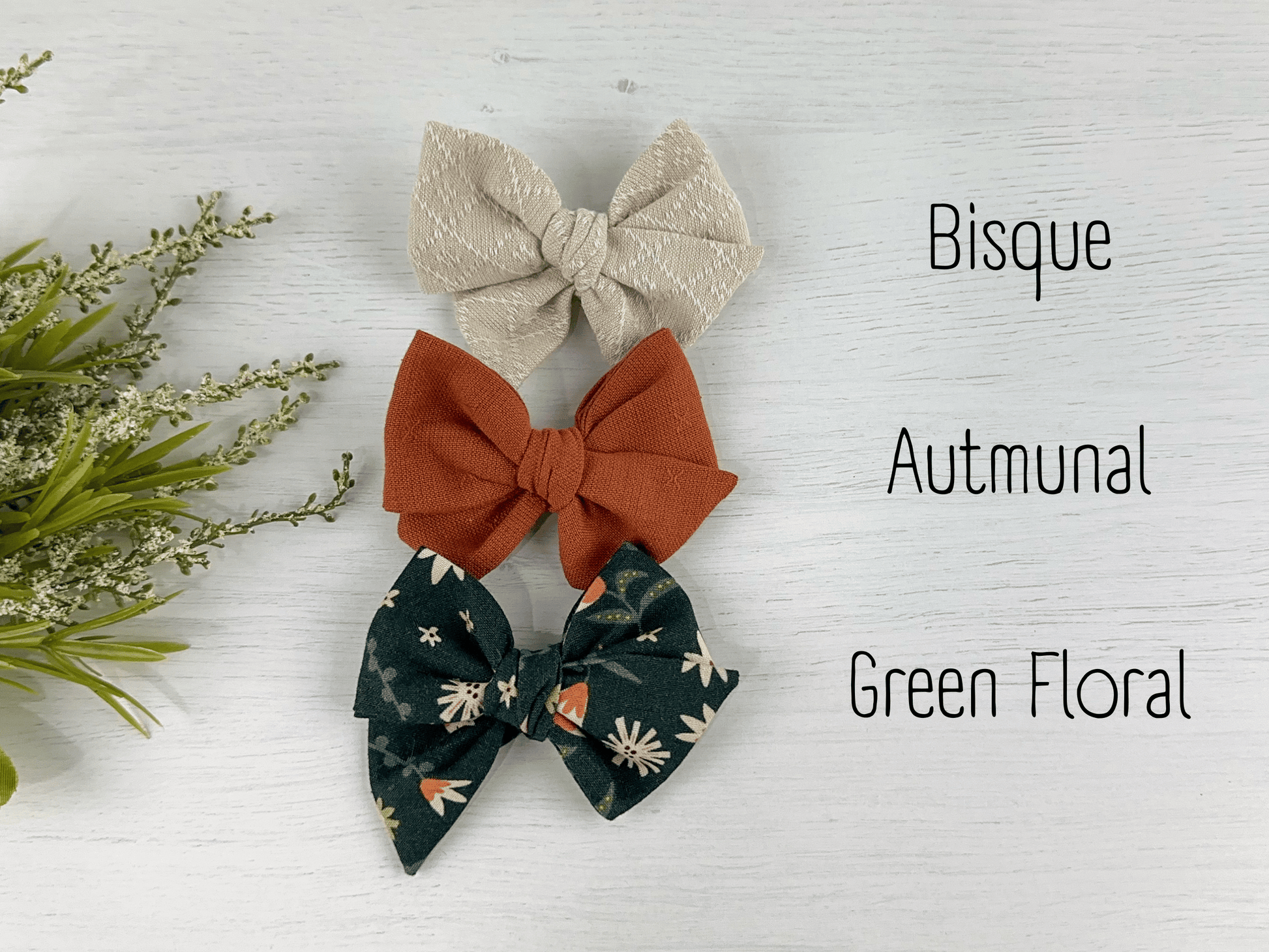 Our Green Floral Fall Pinwheel Bows are available as a set of 3 or individually. Our pinwheel bows are hand tied and are roughly 3” wide.