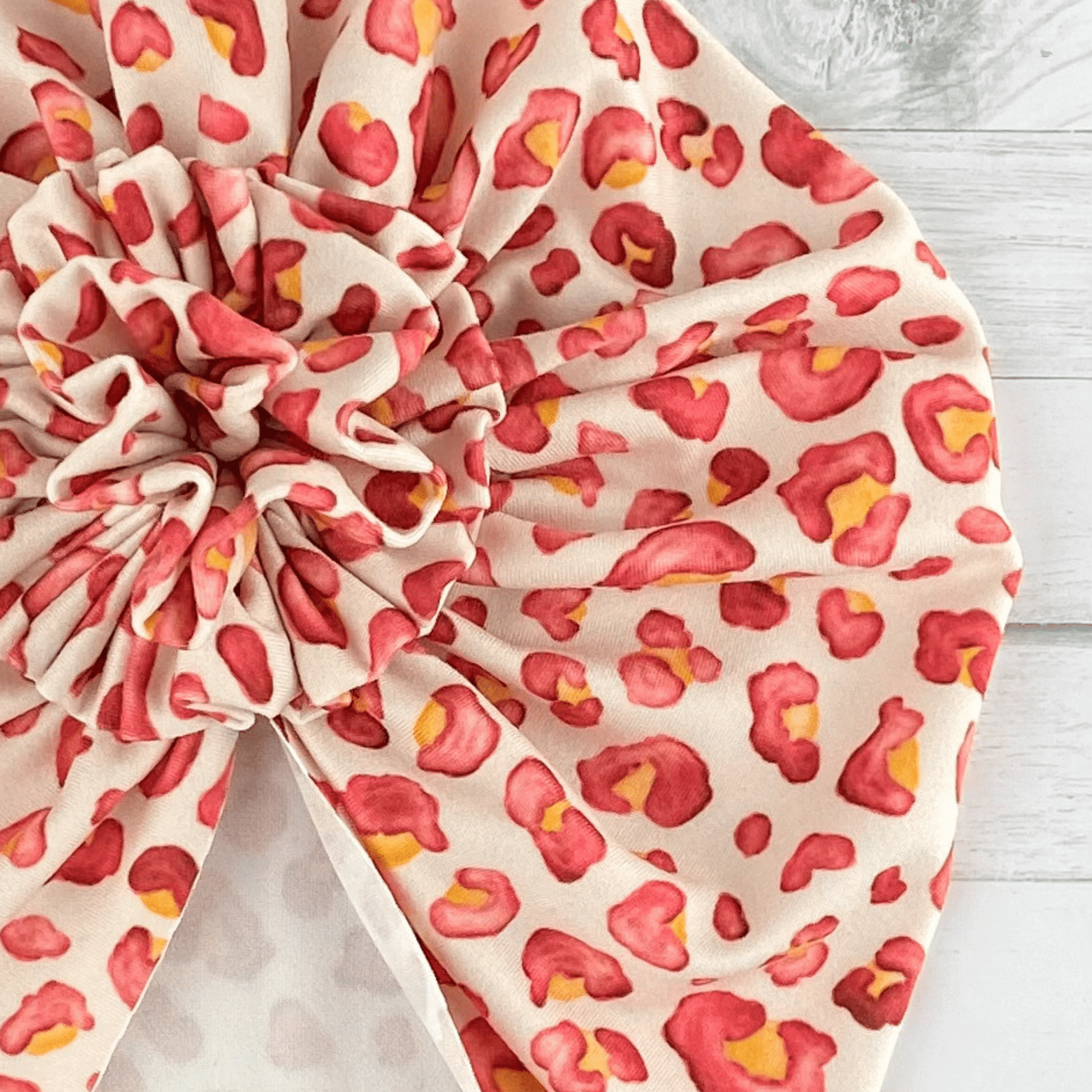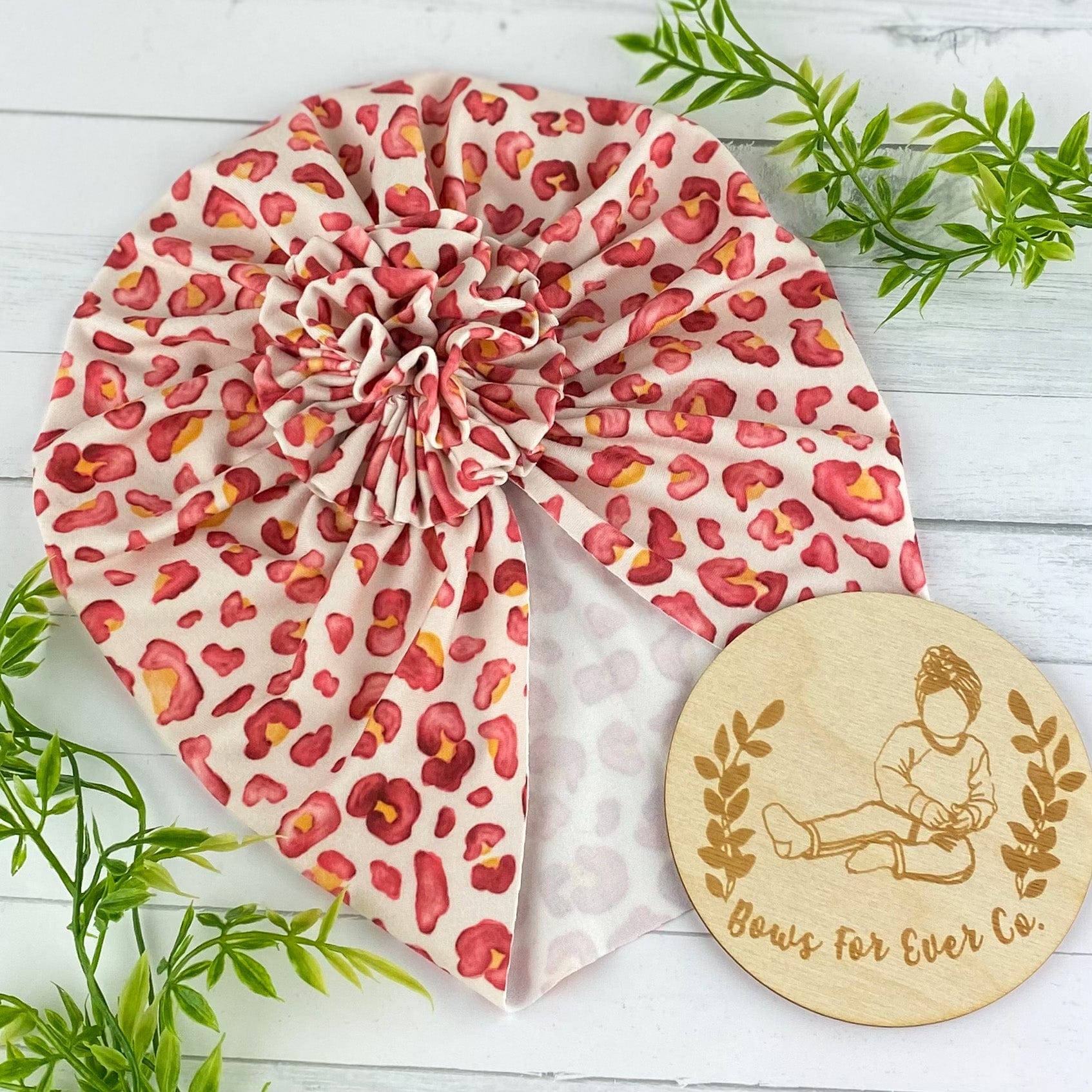 Our Pink Gold Cheetah turban is made with a super soft and stretchy knit fabric.
