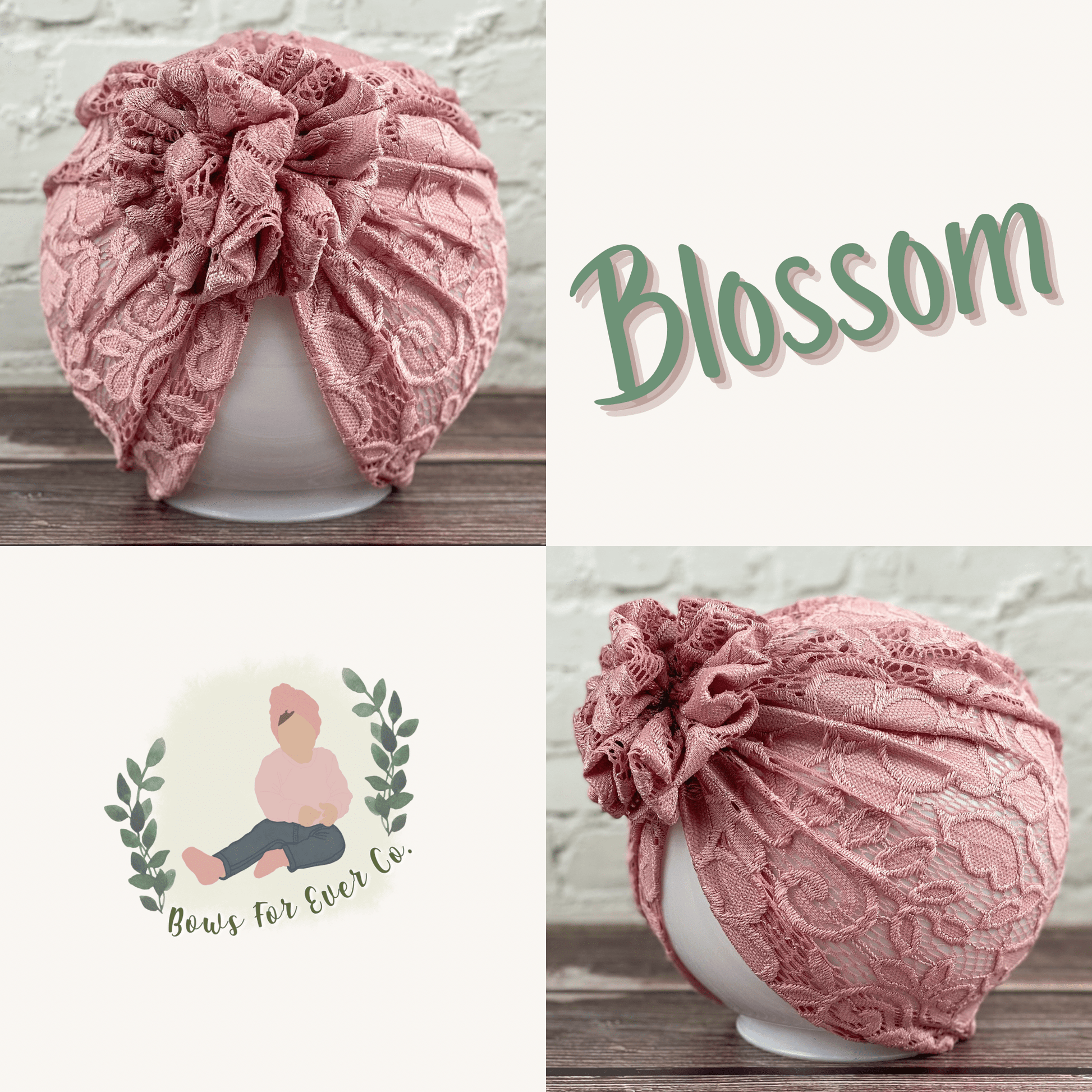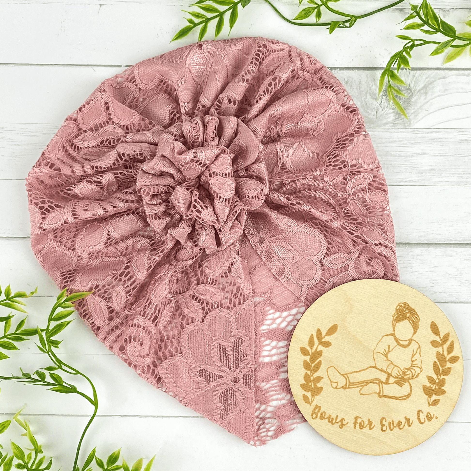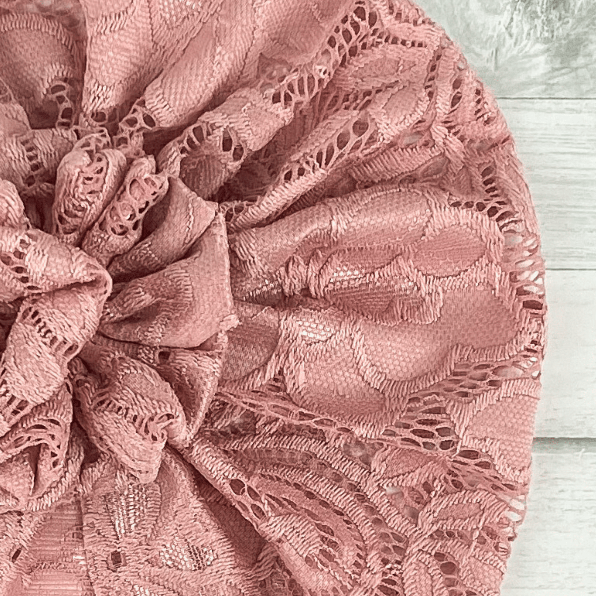 Our Pink Lace turban is made with a super soft knit fabric. This lace fabric has only a slight stretch and may fit a little tighter compared to our other turbans.
