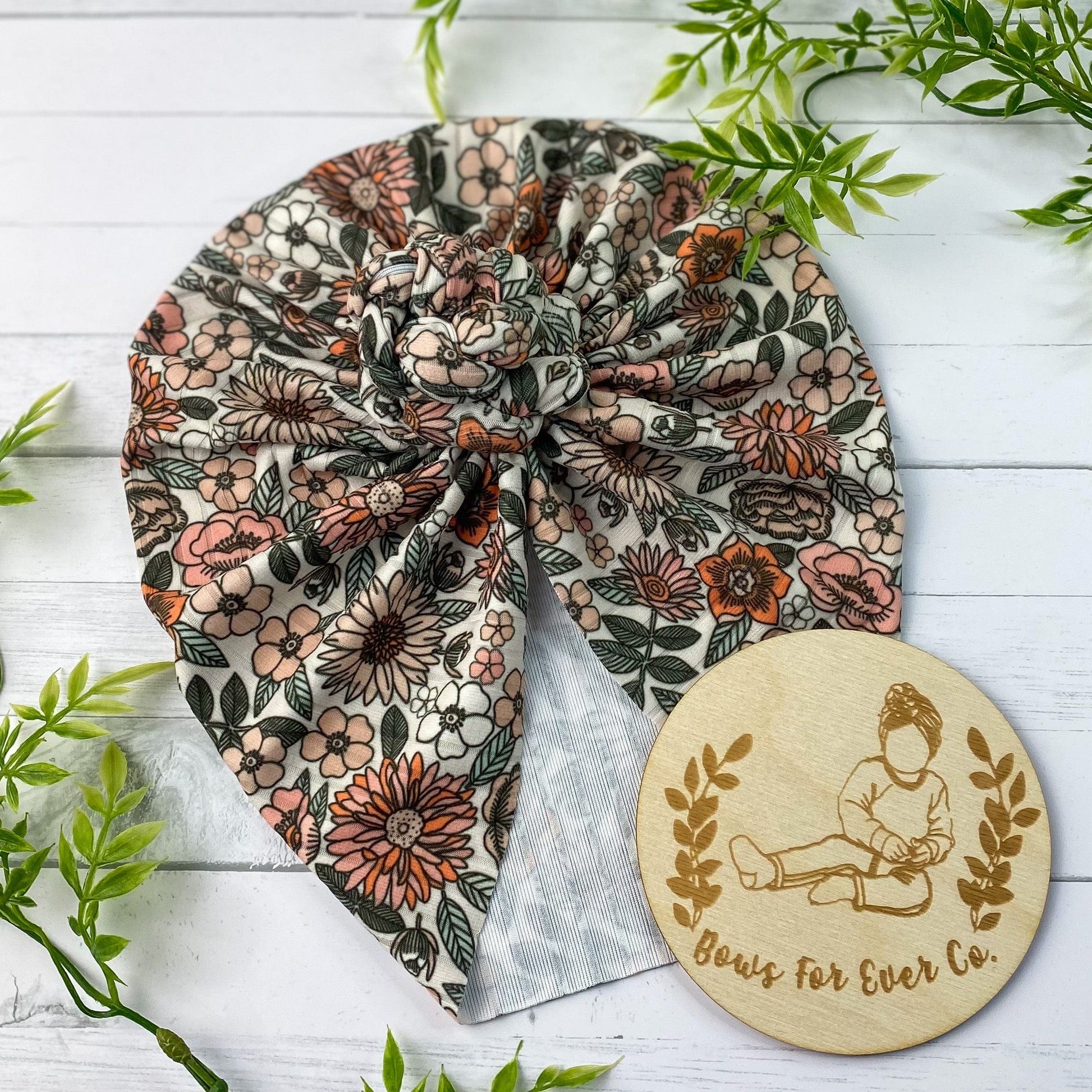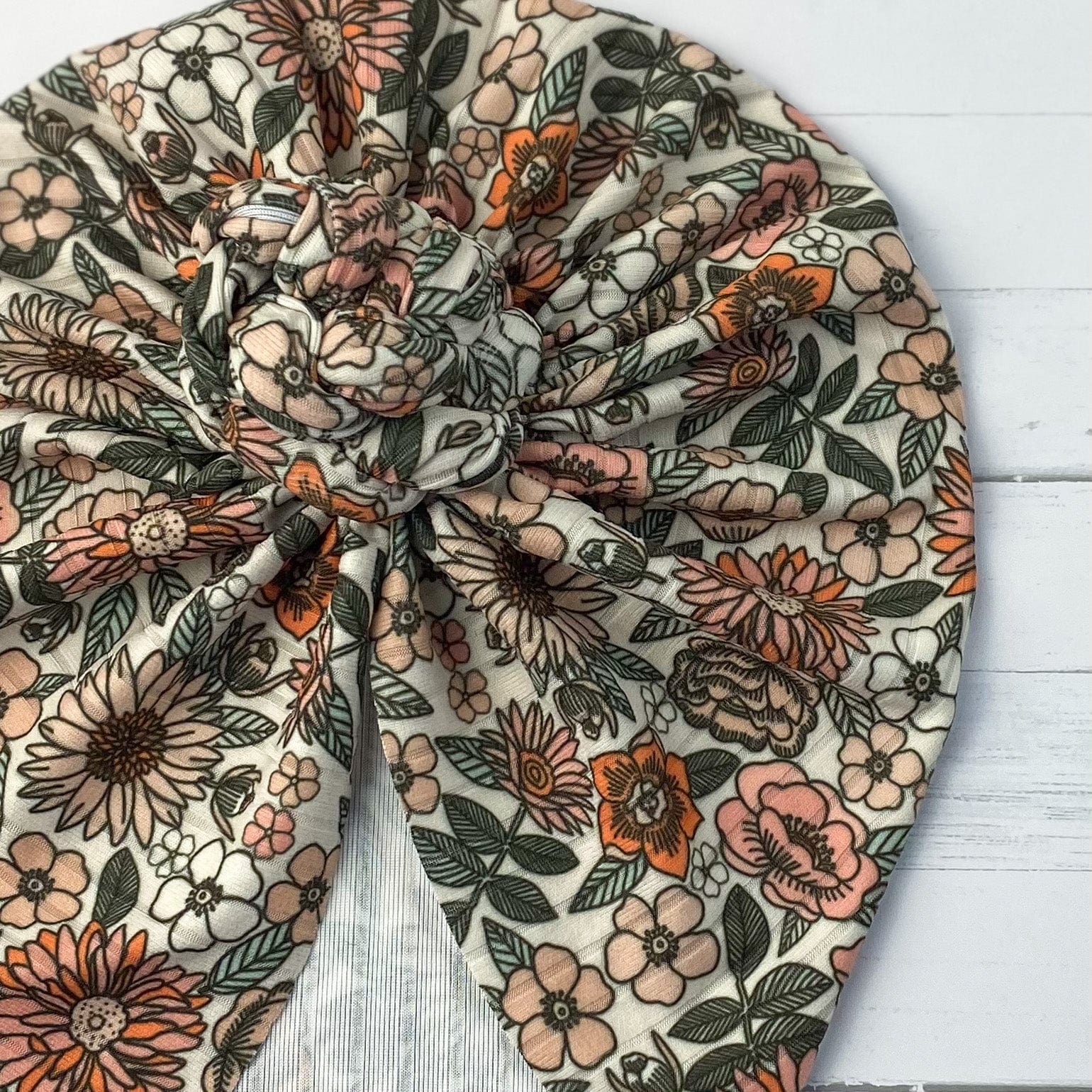 Our Ribbed 70’s Floral turban is made with a super soft and stretchy knit fabric.