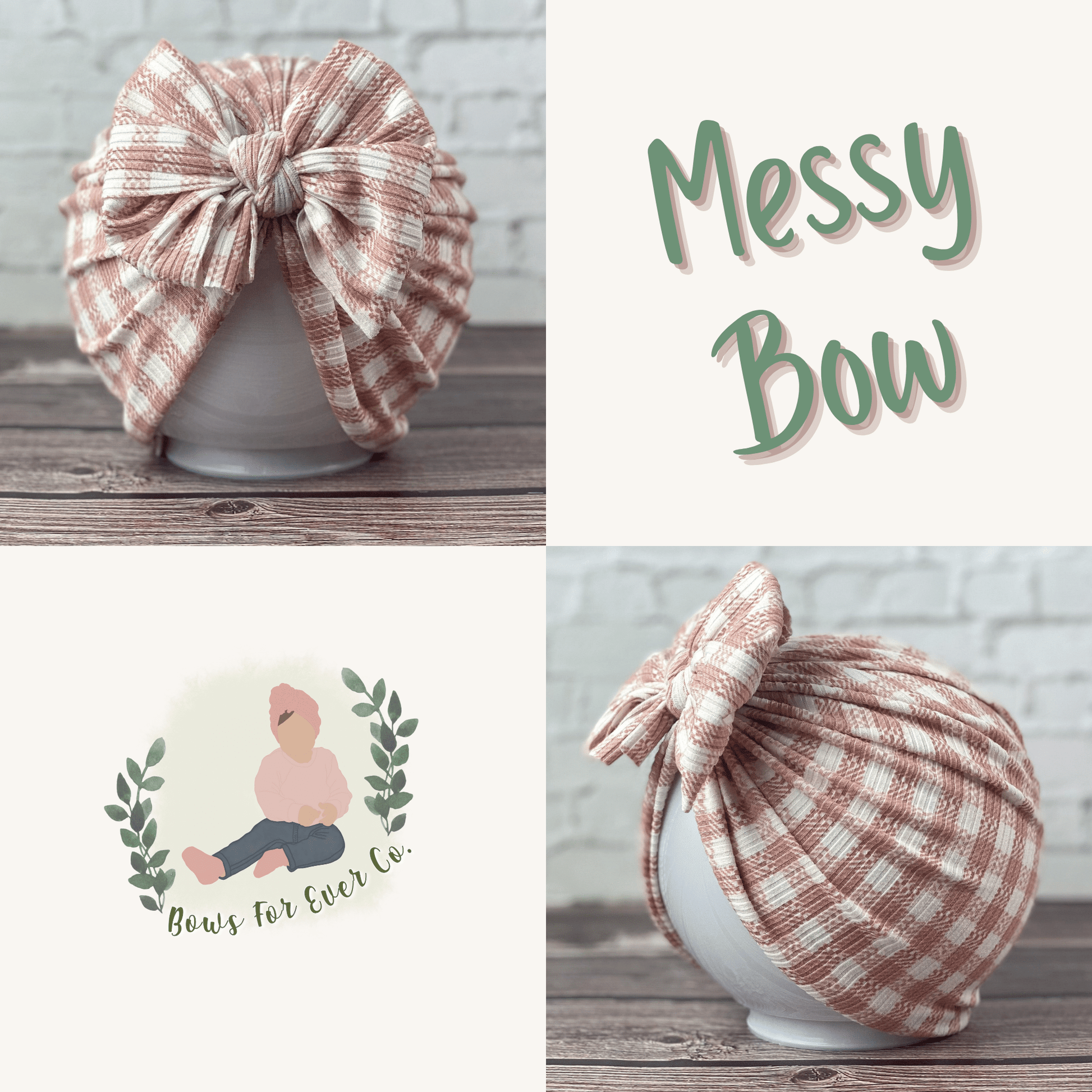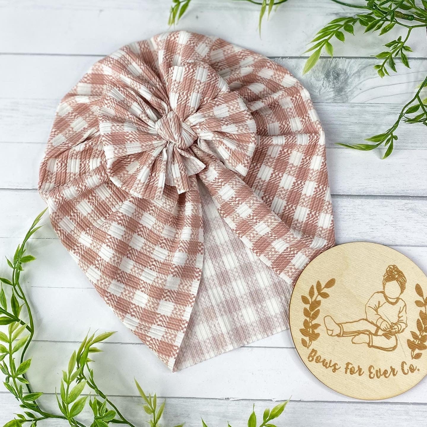 Our Ribbed Blush Gingham turban is made with a super soft and stretchy knit fabric.