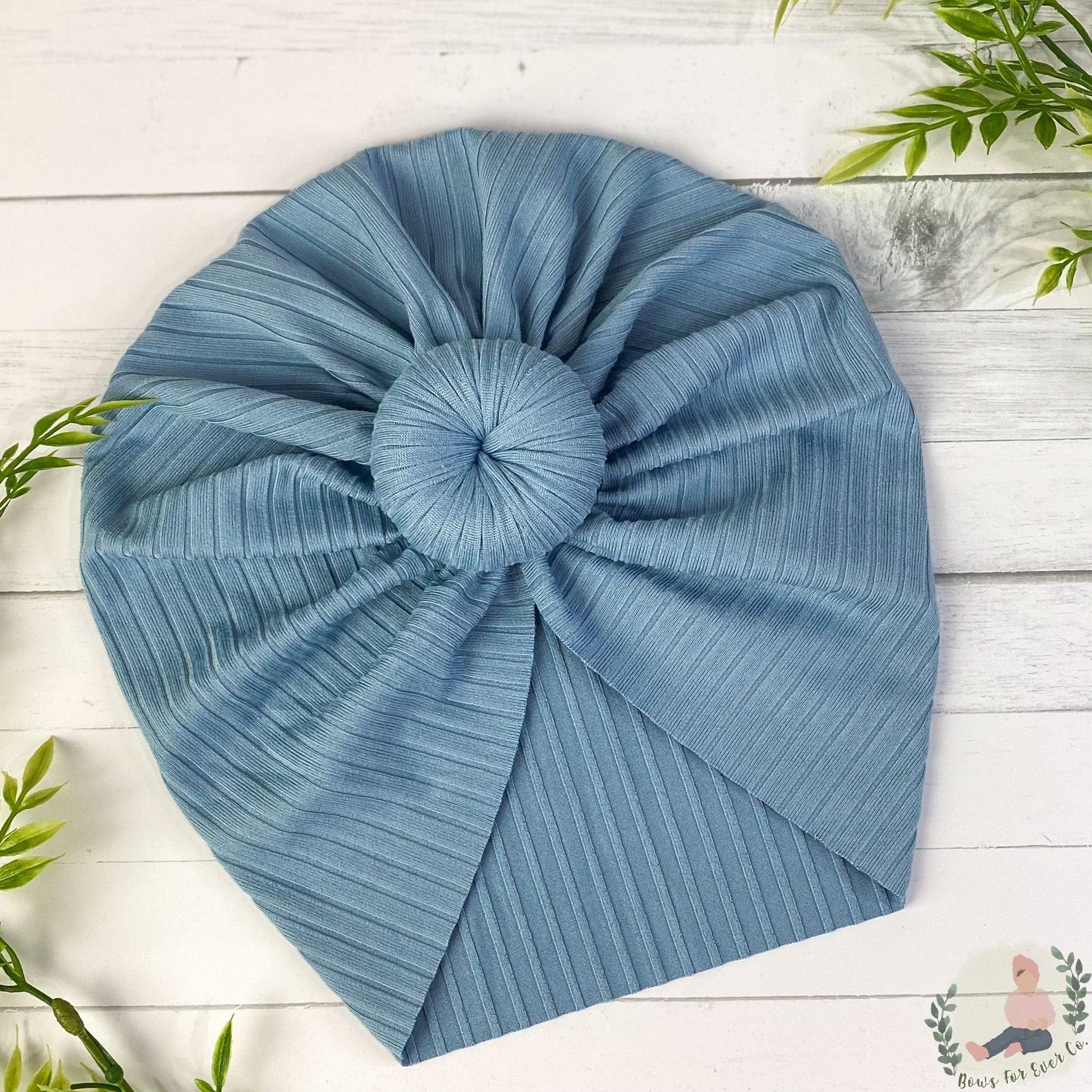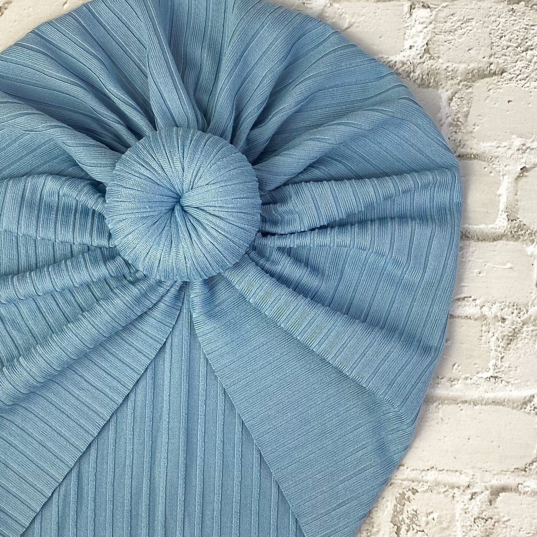 Our Ribbed Chambray turban is made with a super soft and stretchy knit fabric.
