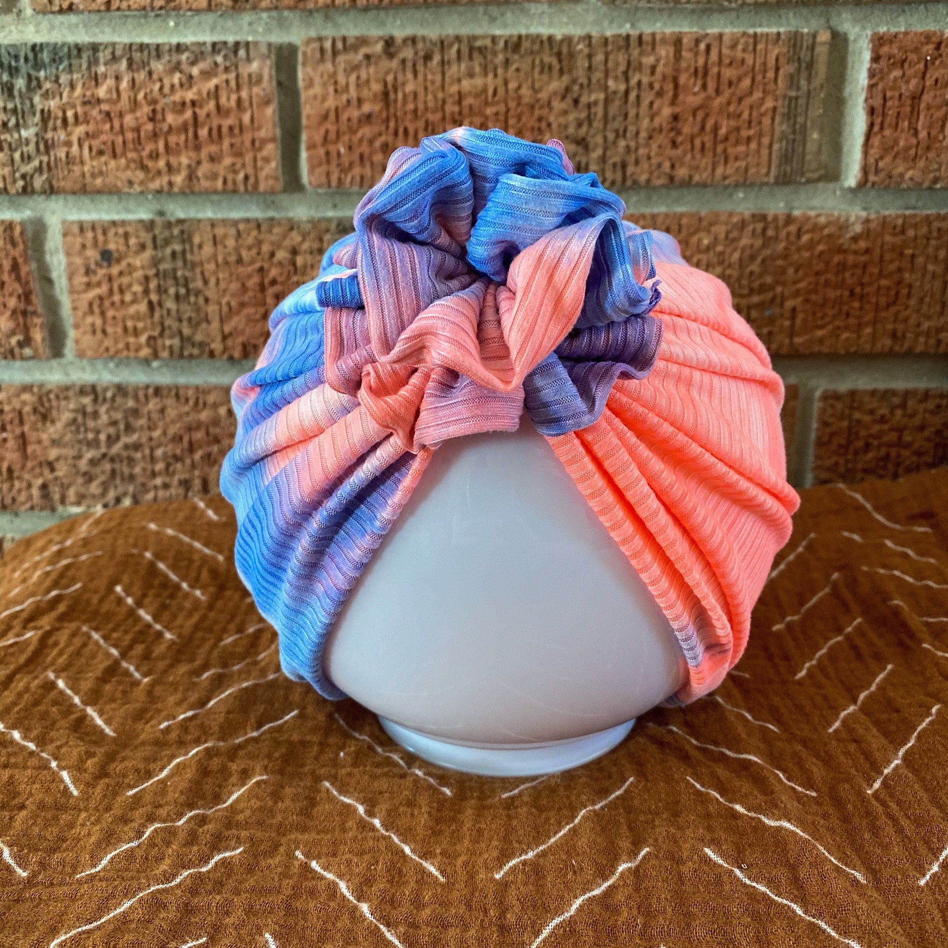 Our Ribbed Cotton Candy Tie Dye turban is made with a super soft and stretchy knit fabric.