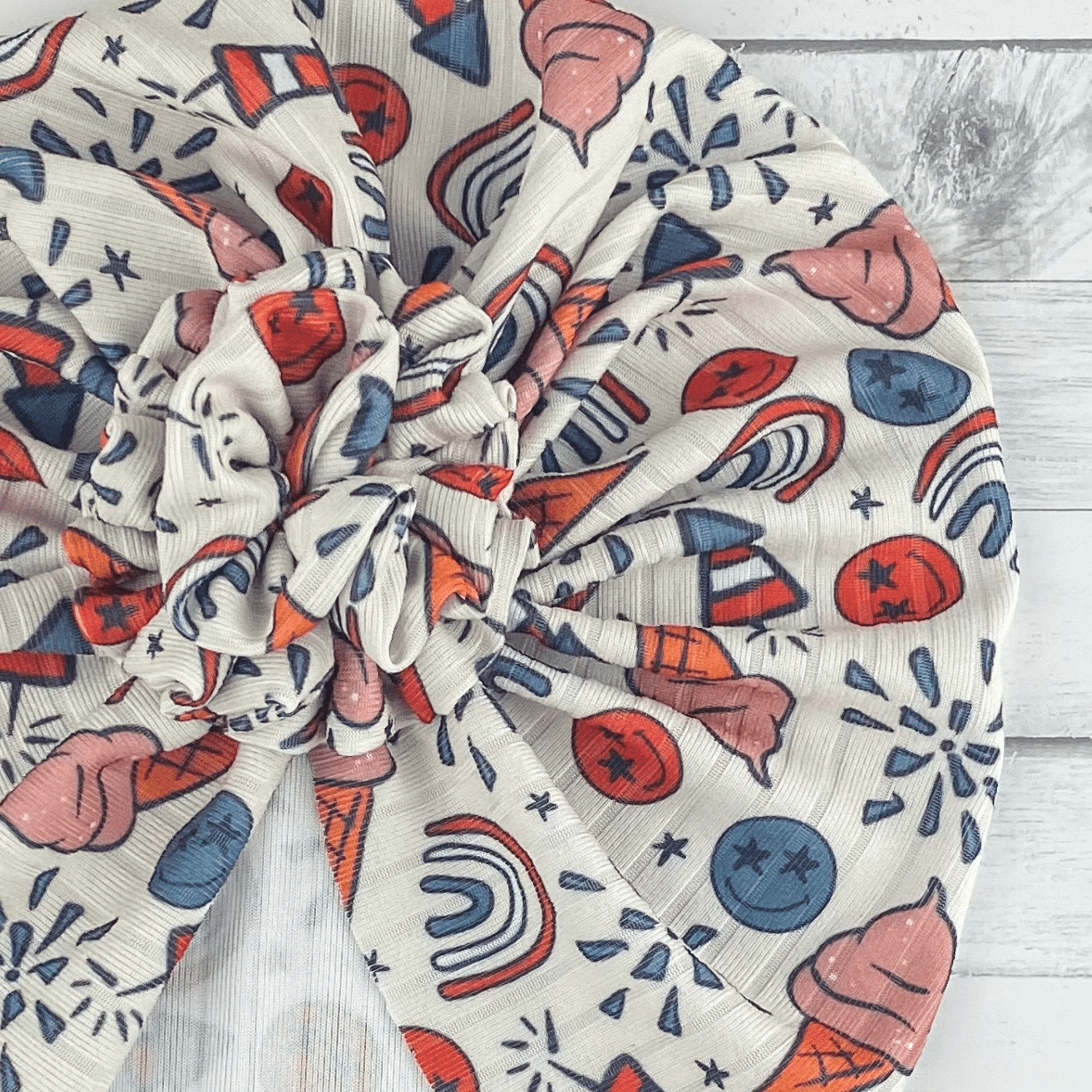 Our Ribbed Fireworks turban is made with a super soft and stretchy knit fabric.