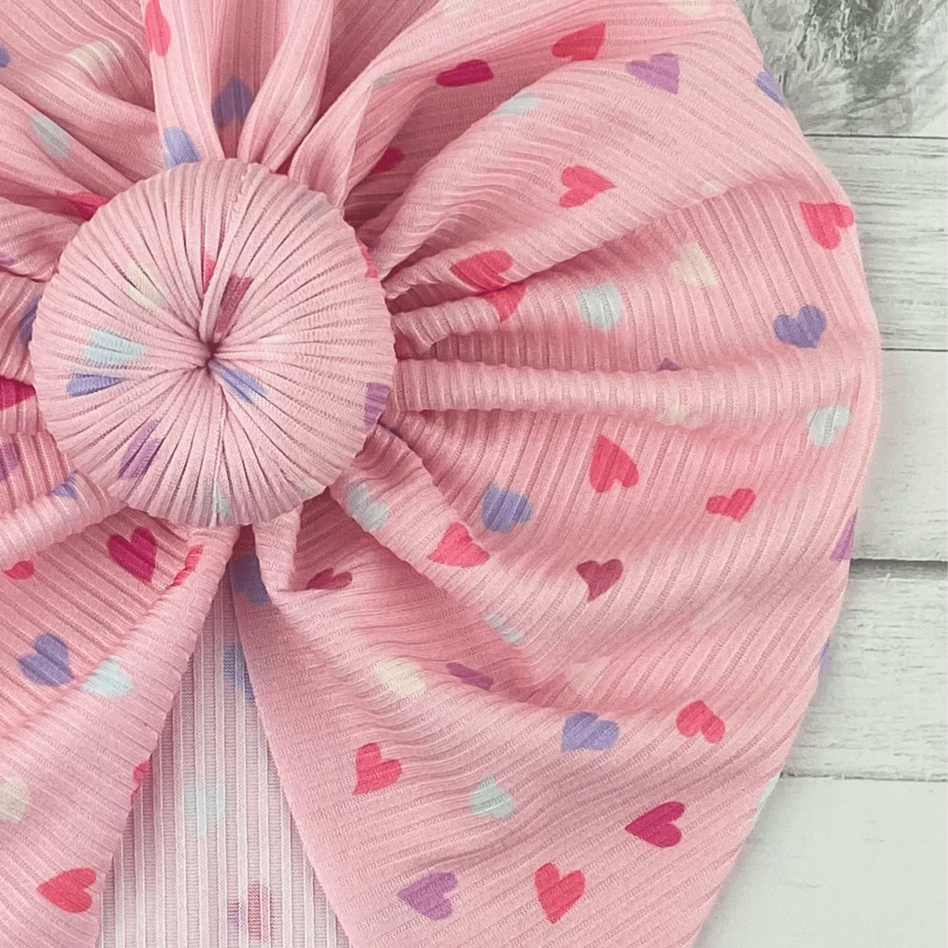 Our Ribbed Pastel Hearts turban is made with a super soft and stretchy knit fabric.
