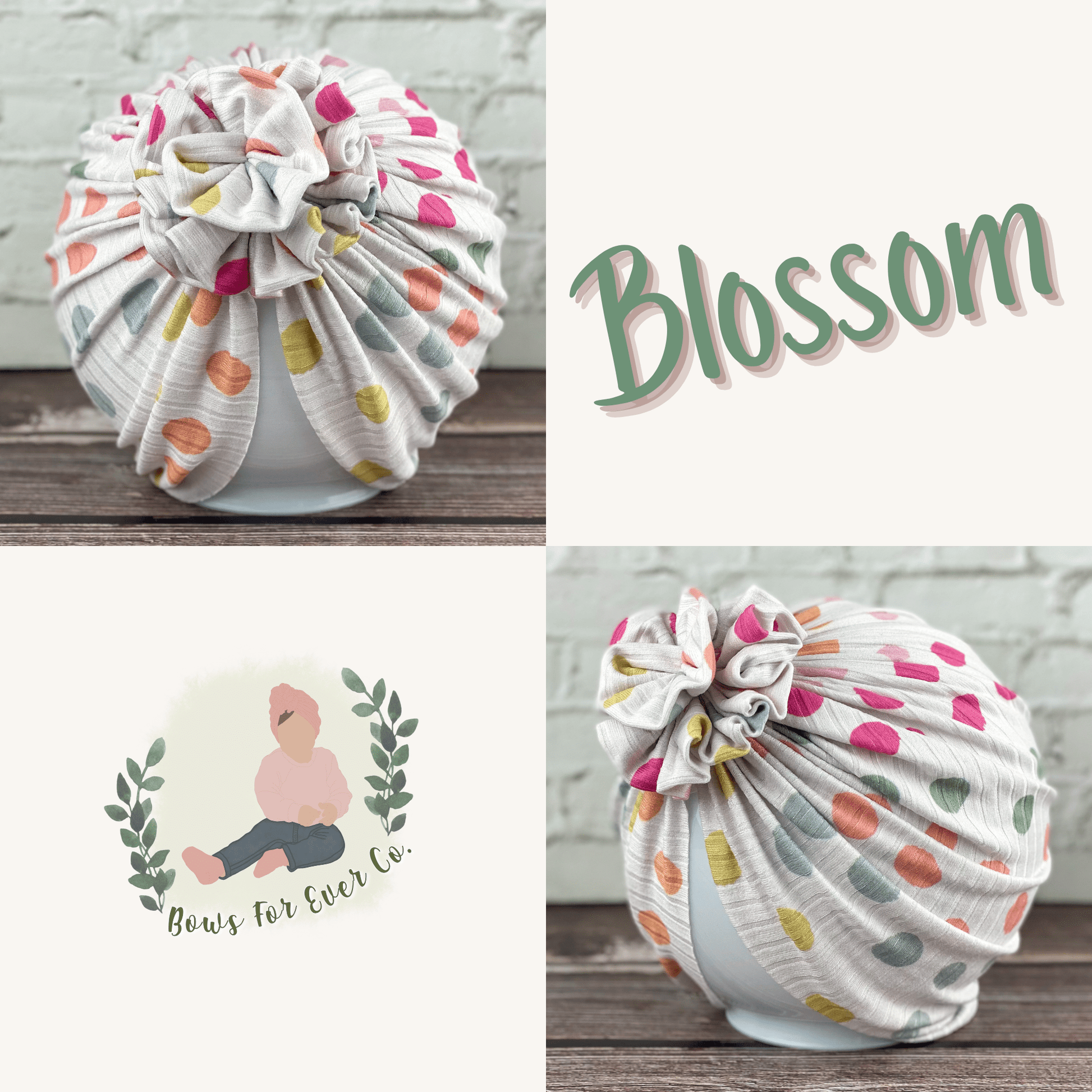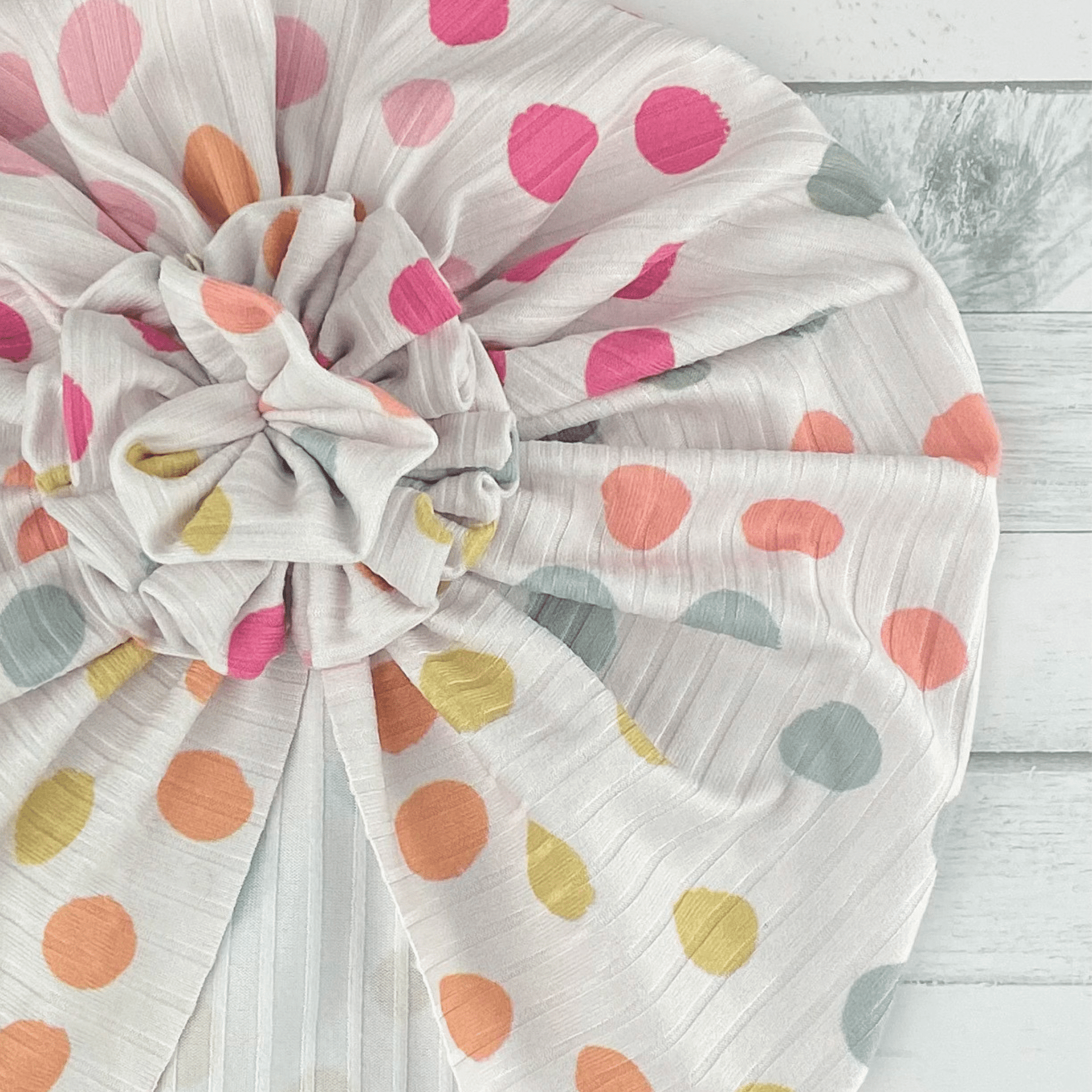 Our Ribbed Pastel Polka Dots turban is made with a super soft and stretchy knit fabric.