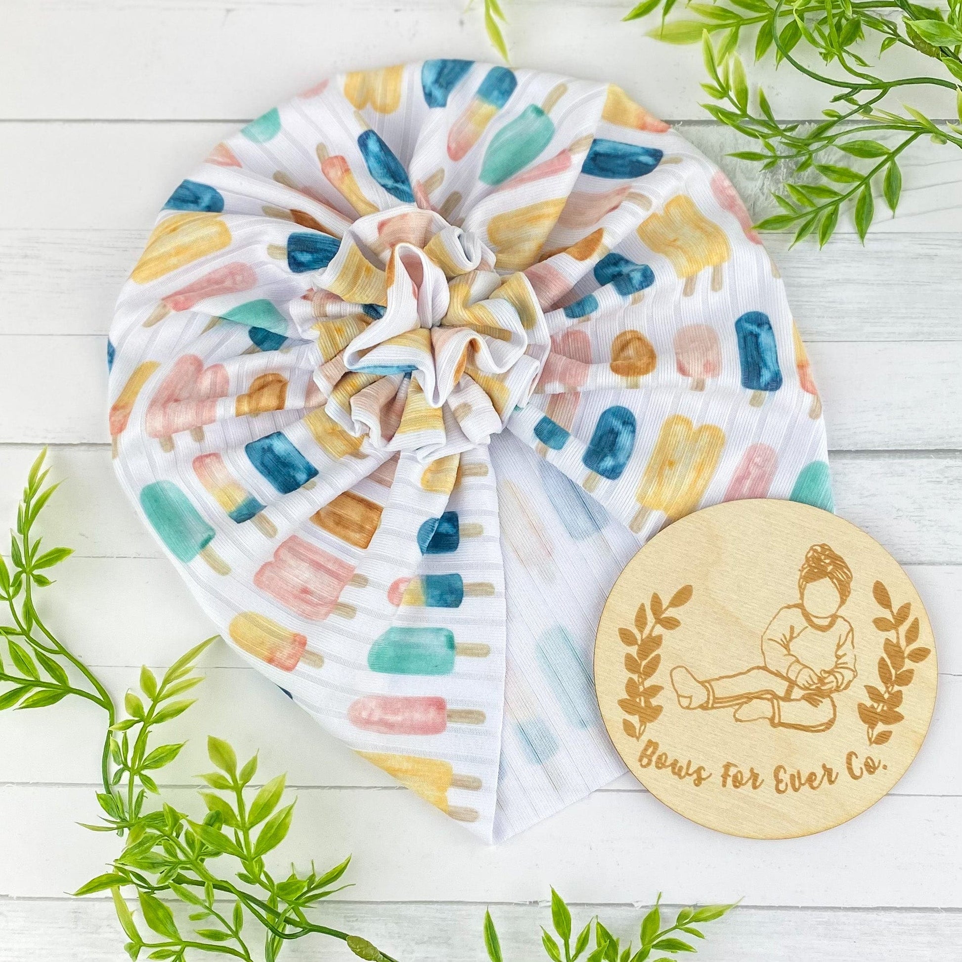 Our Ribbed Popsicles turban is made with a super soft and stretchy knit fabric.