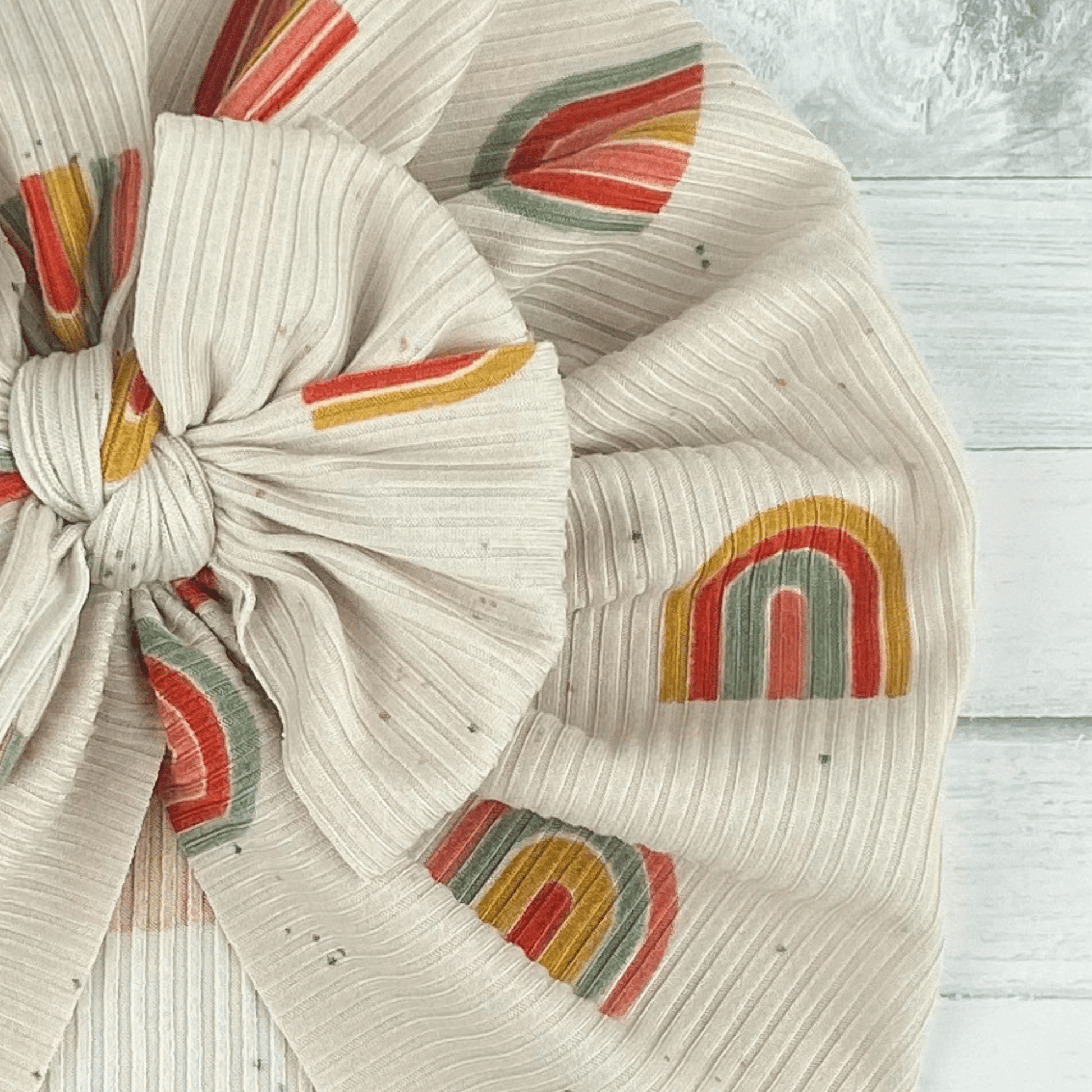 Our Ribbed Rainbows turban is made with a super soft and stretchy knit fabric.