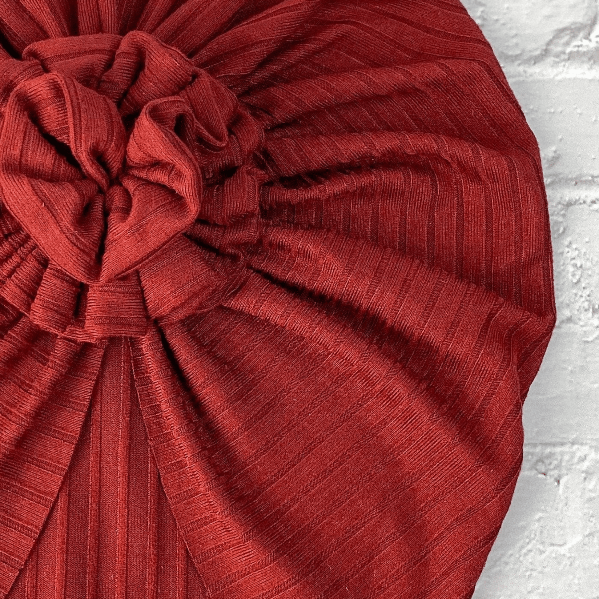 Our Ribbed Red Spice turban is made with a super soft and stretchy knit fabric.