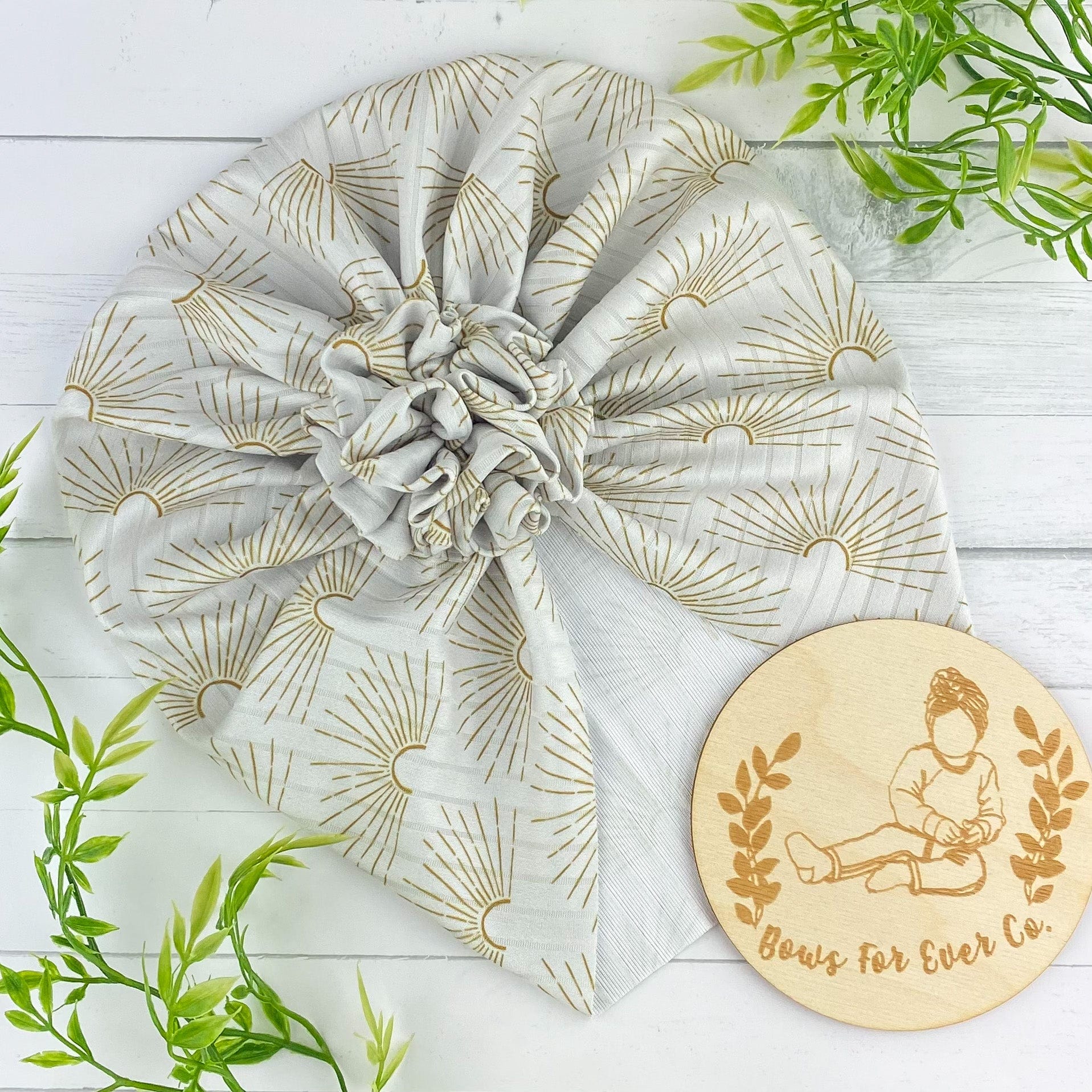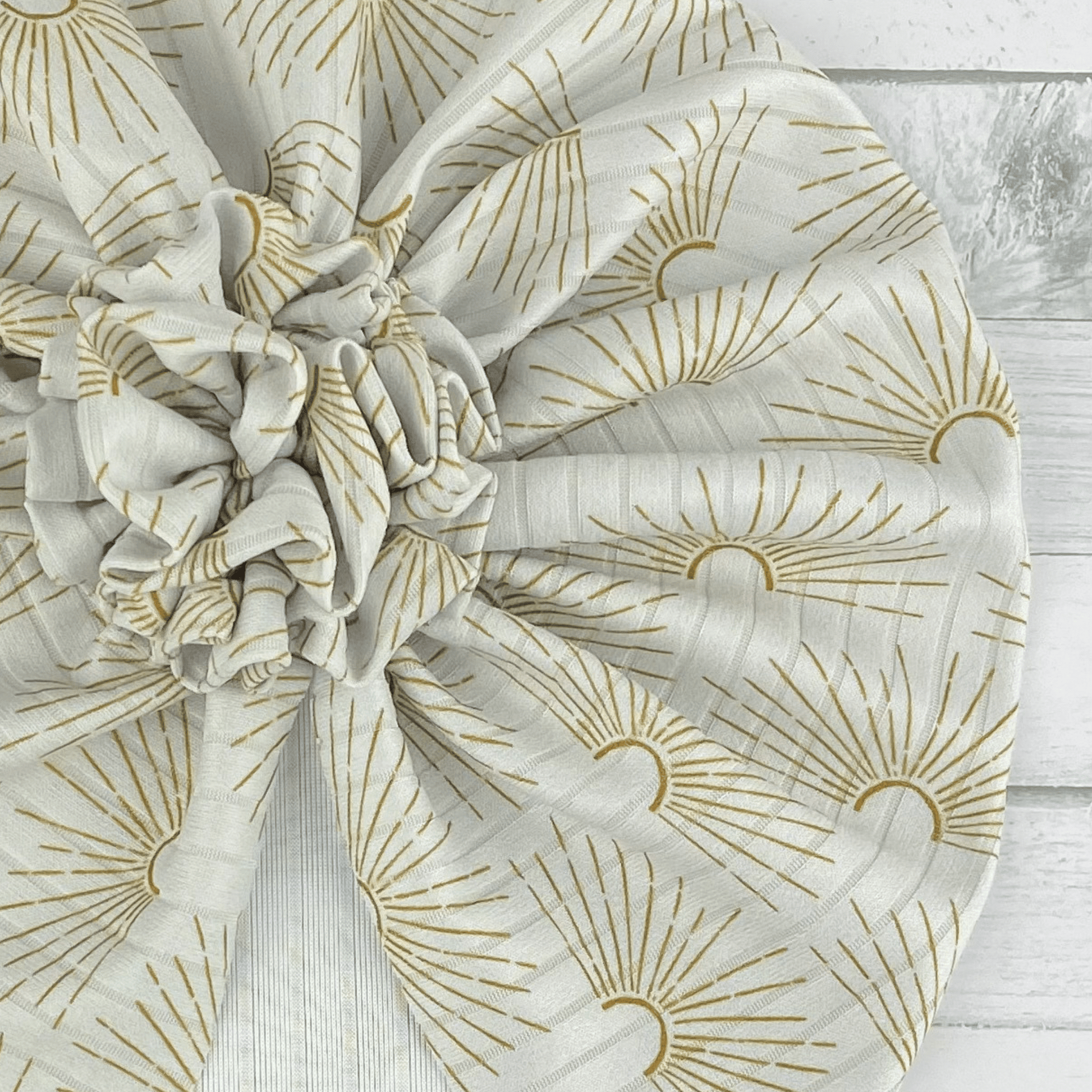 Our Ribbed Sunburst turban is made with a super soft and stretchy knit fabric.