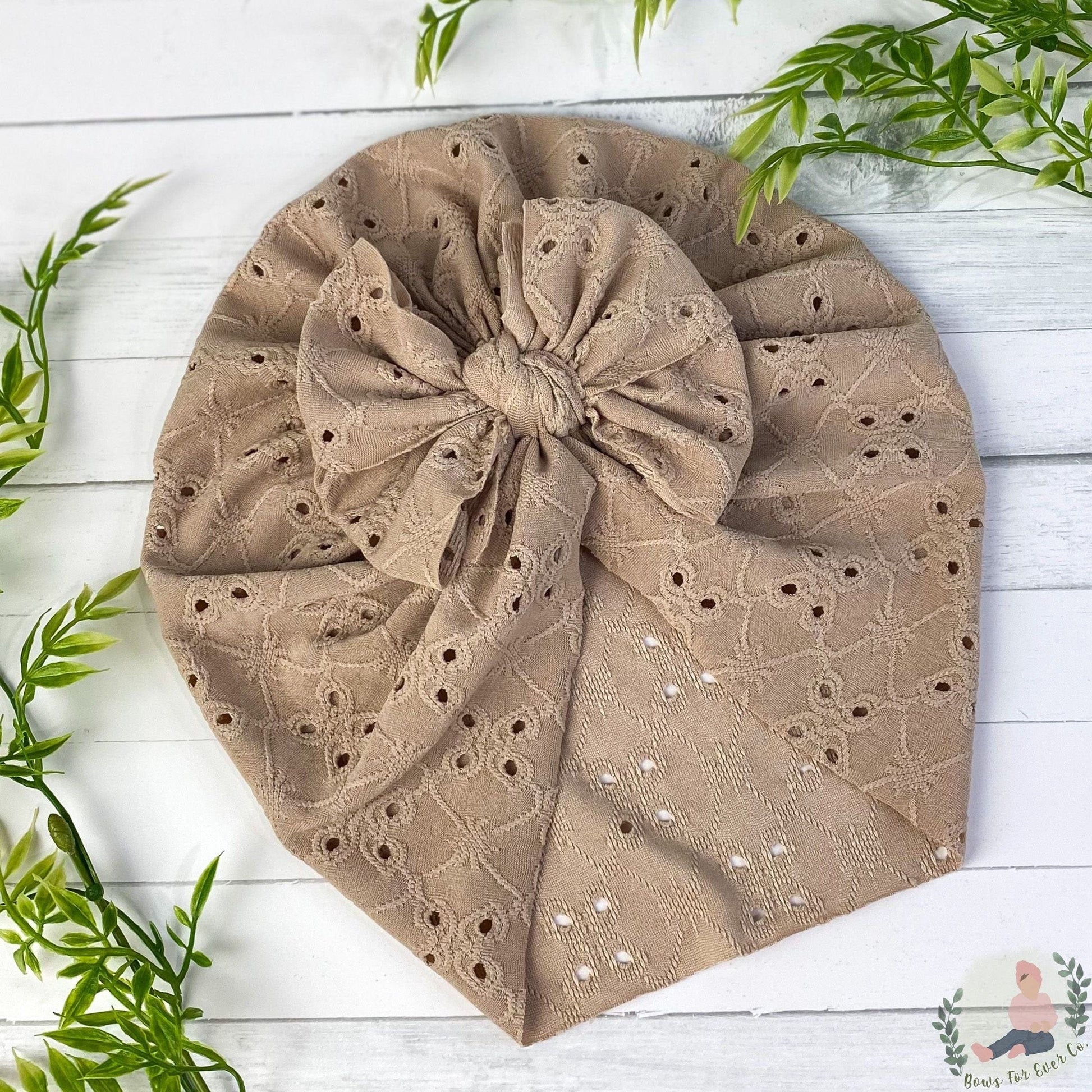 Our Taupe Eyelet turban is made with a super soft and stretchy knit fabric.