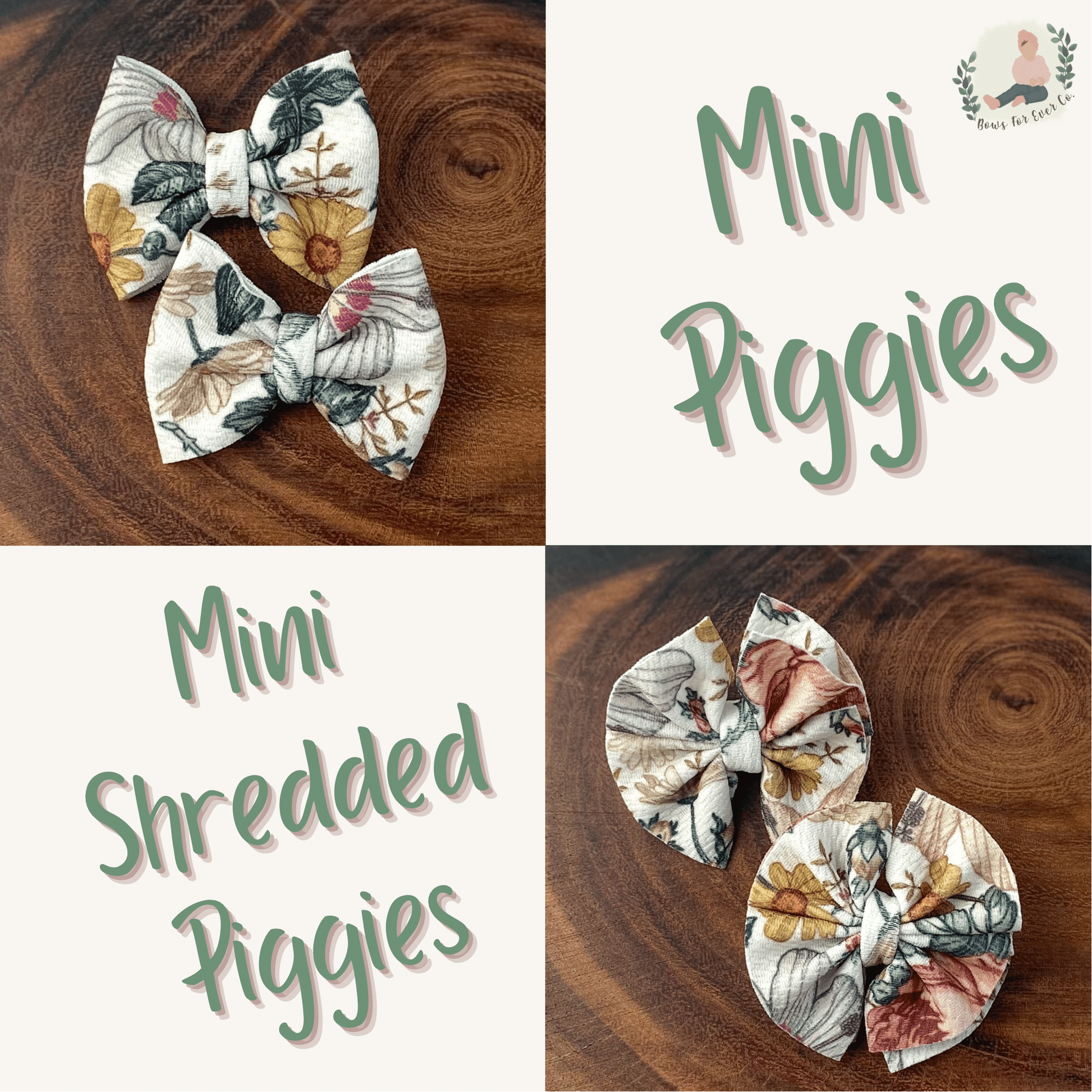 Big Bows are approximately 5 in. and Mini Piggies are approximately 2.5 in. and are sold as a set of 2.