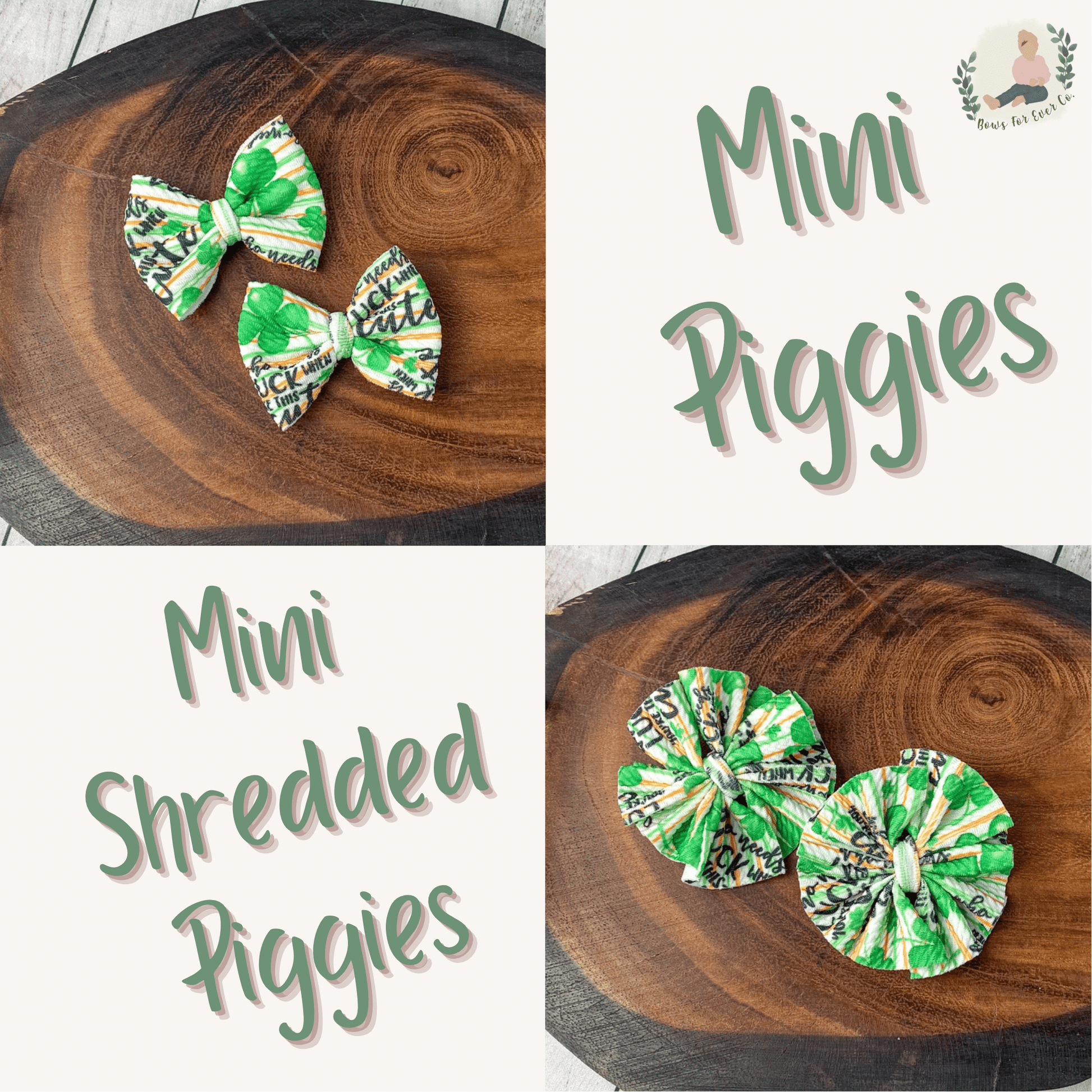 Big Bows are approximately 5 in. and Mini Piggies are approximately 2.5 in. and are sold as a set of 2.